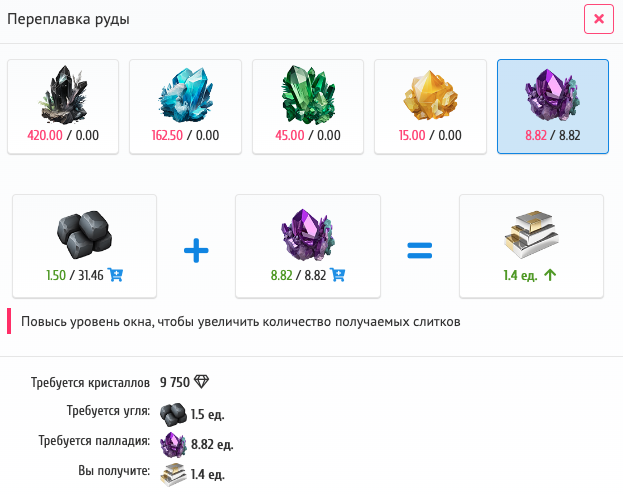 We see that we need 1.5 coal and 8.82 palladium to get 1.4 ingots. Okay, let's go count! We buy all this on the exchange at an average price and start remelting. We wait for our brave employees to smelt the ore and coal into ingots. We pay the salary, sell the ingot and go count the profit!