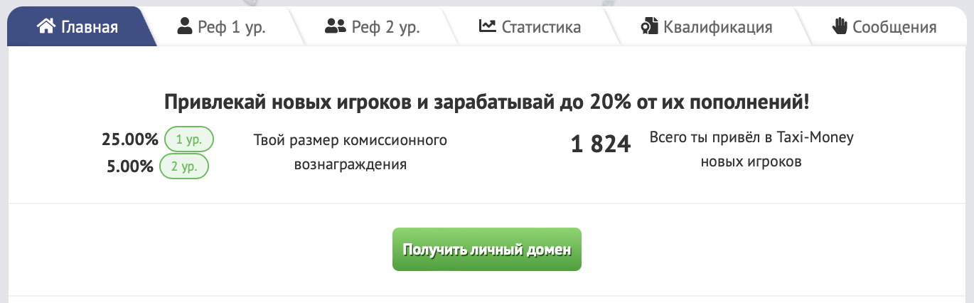 Вы будете получать до 25% от рефералов 1 уровня и до 5% от рефералов 2 уровня. Средства зачисляются равными суммами на пассажирский счет, счет вывода и жетоны. Таким образом, вы сможете зарабатывать вообще без вложений!