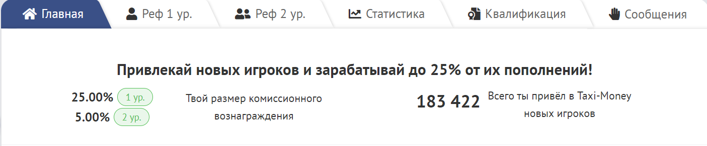 Вы будете получать до 20% от рефералов. Средства зачисляются равными суммами на пассажирский счет, счет вывода и жетоны. Таким образом, вы сможете зарабатывать вообще без вложений!