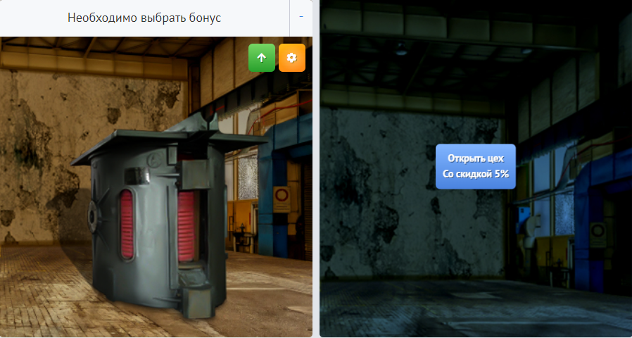 После открытия Фабрики или нового цеха, необходимо выбрать бонус, который этот цех будет производить. Для этого нажмите на жёлтую кнопку с шестерёнкой и выберите бонус в выпадающем списке «Активный бонус».