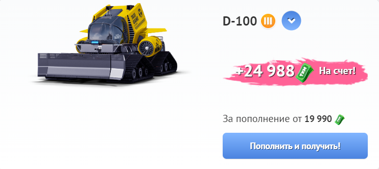 Другие можно получить только во время проведения акции. Для этого необходимо пополнить счёт покупок в соответствии с сеткой акции. Вы получите бульдозер в подарок, внесённые средства зачислятся на Ваш счёт покупок, а бонусный счёт будет пополнен кэшбэком в установленном размере. Следите за новостями, чтобы не пропустить такую акцию.