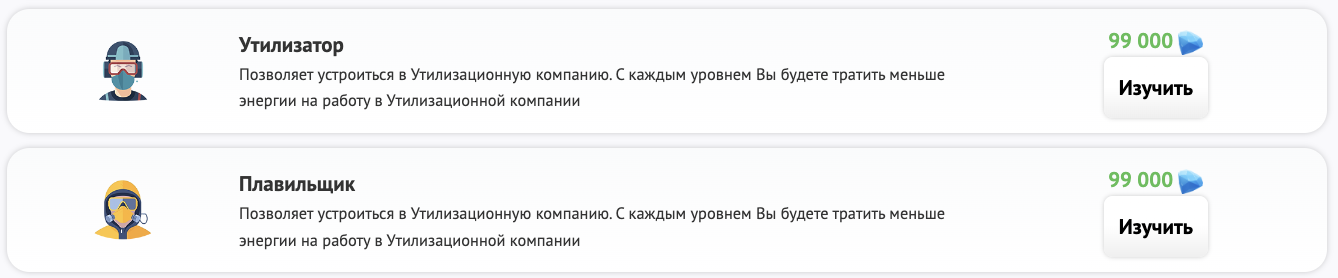 Во-вторых, Вы можете устроиться в Утилизационную компанию и получать зарплату за эту работу! Изучите и улучшайте навыки «Утилизатора» и «Плавильщика», чтобы устроиться в Утилизационную компанию и делать там дополнительный заработок!