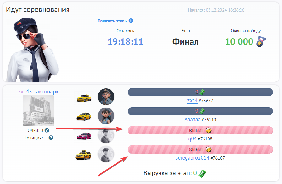 На этапе турнира, когда команды начинают зарабатывать очки для своей команды с помощью заказов, обладатель такси “Фантомас” может выбивать своих оппонентов из текущего этапа гонки, вместе со всеми заработанными очками.