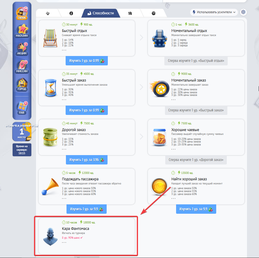Для флагманского такси “Фантомас” мы сделали специальную способность, которая под стать одноименному вымышленному персонажу и гениальному преступник. Эта способность поможет Вам брать первые места во множестве конкурсов и оставлять Ваших соперников позади.