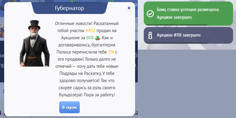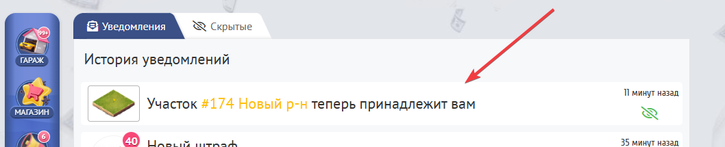 После победы на аукционе, Вы увидите уведомление о его окончание и принадлежащим Вам участке.Он будет показан в Ваших Владениях.