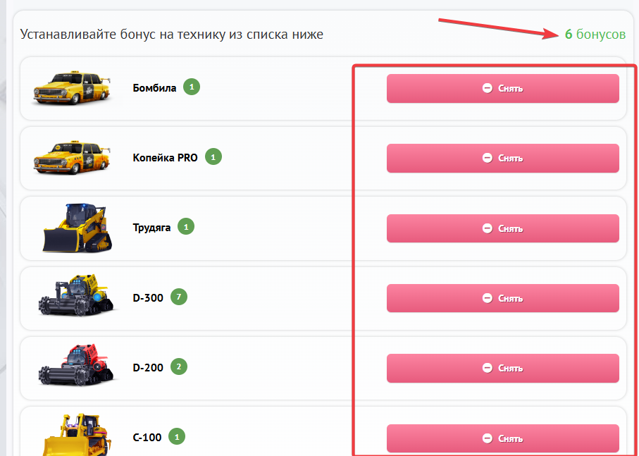 Отображение бонуса на технике также присутствует как в Гараже
