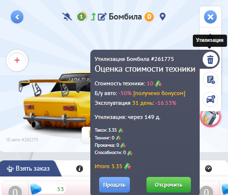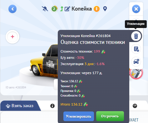 Для освобождения места в гараже и обмена других авто на деньги предусмотрена функция утилизации.  Деньги поступят на счет покупок после окончания работ по утилизации техники.