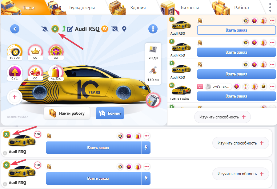 Когда Ваше такси получило новый уровень, вместо цифры следующего уровня у Вас будет появляться вот такая иконка, на странице гаража/самого такси