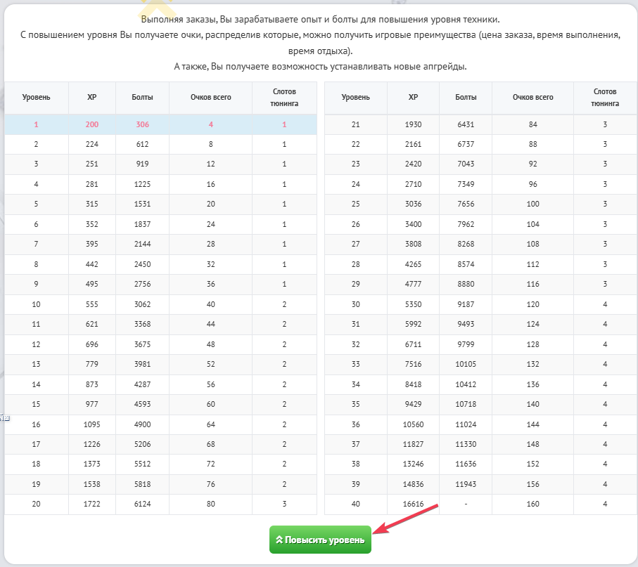 После того, как данная иконка появилась, Вам нужно нажать на нее, чтобы открылось меню увеличения уровня Вашего такси, где подробно расписано: какое количество болтов и опыта нужно для перехода на следующий уровень, а также какое количество слотов тюнинга у Вас будет после перехода на следующий уровень.