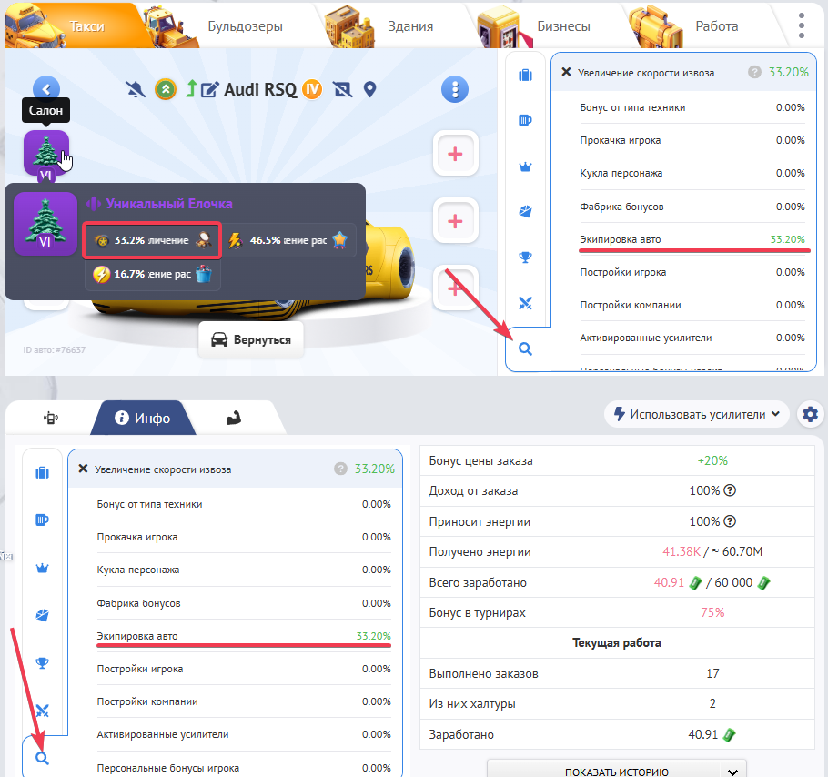В “меню тюнинг” и вкладке инфо  будут отображены Ваши бонусы от вещей по типу заказа, которые Вы наденете после того, как добудете их с заказов например: Вы выбили себе вещь, которая дает “увеличение скорости извоза” у заказа типа “Поиски”