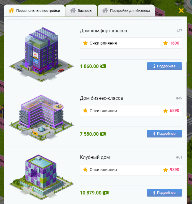 На каждом участке земли под застройку может быть построено отдельное здание. Покупка здания выполняется с помощью платежных систем.