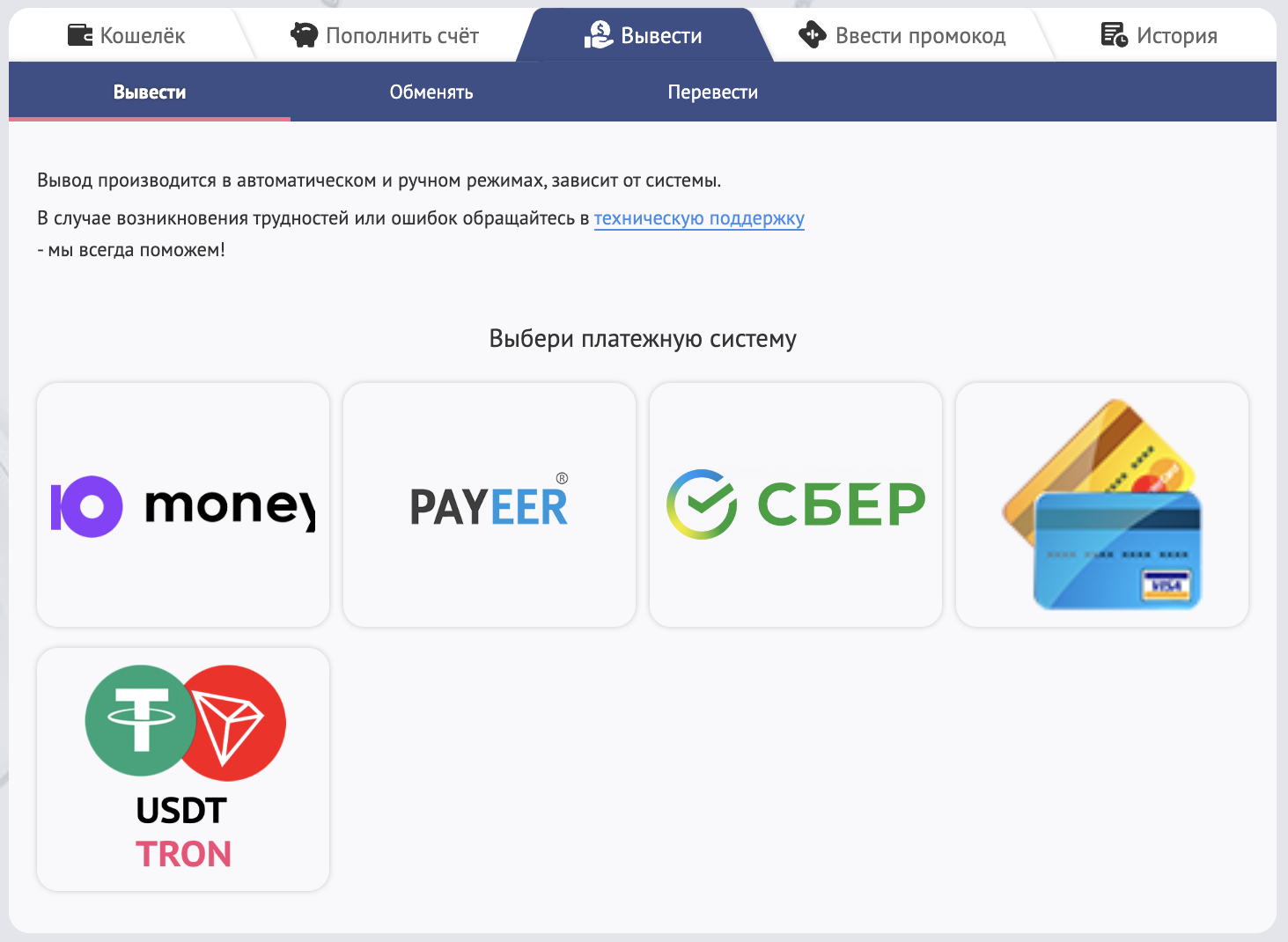 Для вывода средств выберите платежную систему и следуйте инструкциям. В случае возникновения трудностей или ошибок обращайтесь в техническую поддержку – мы всегда поможем!