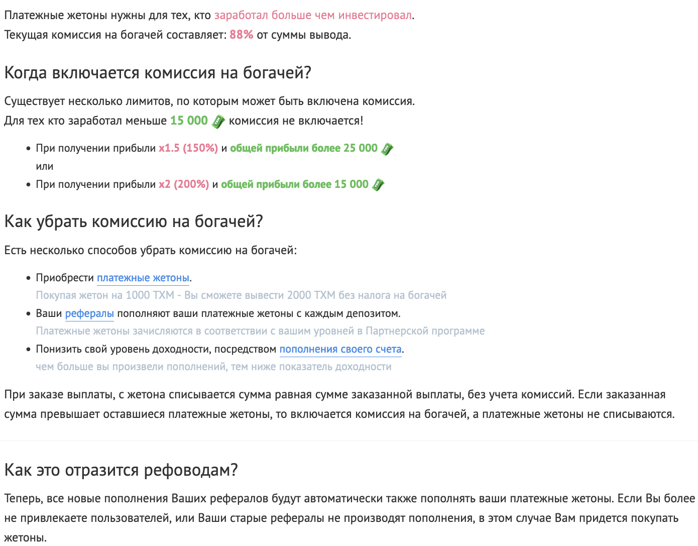 Для тех, кто получил прибыль в два раза больше своих инвестиций включается специальная комиссия на богачей в размере 88% от суммы вывода.
