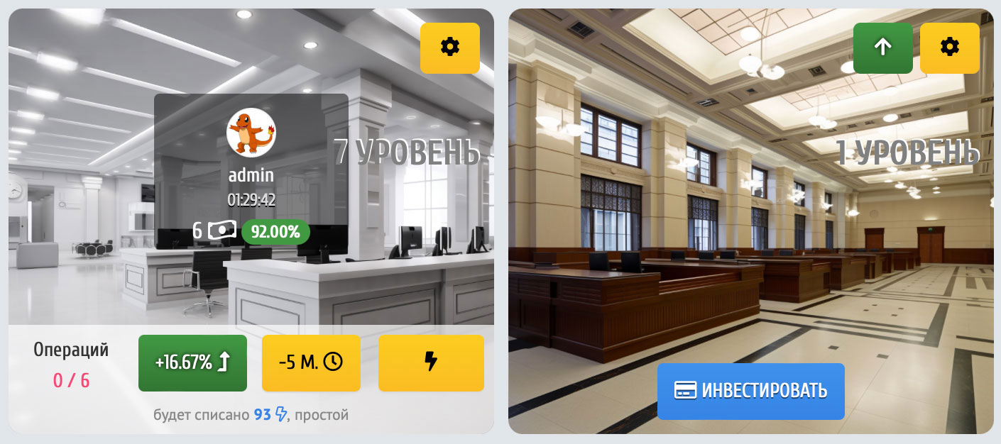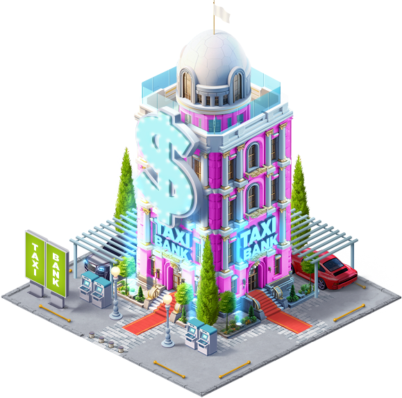 Чтобы открыть свой банк, тебе необходимо построить здание Банка на свободном участке в Полисе. Прокачивай уровень здания своего Банка, чтобы увеличивать количество и доступный уровень рабочих окон, а также максимально возможное количество сотрудников! Развивай рабочие места Банка, чтобы увеличить максимально возможную доходность своих клиентов!